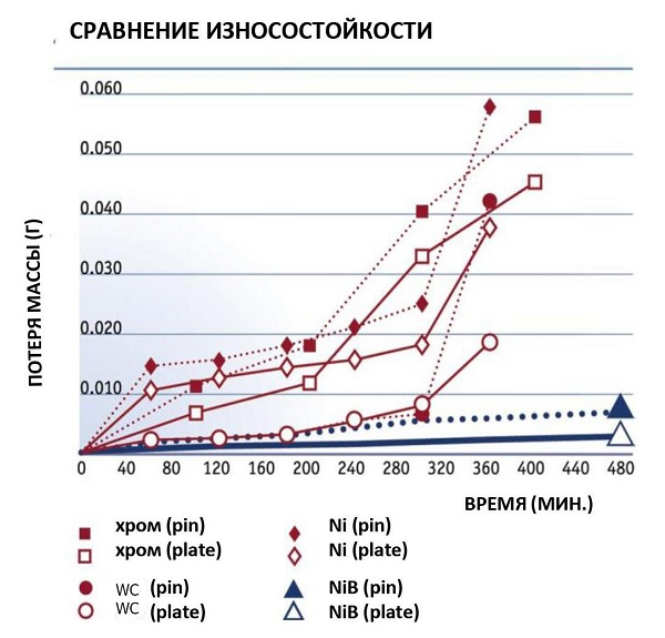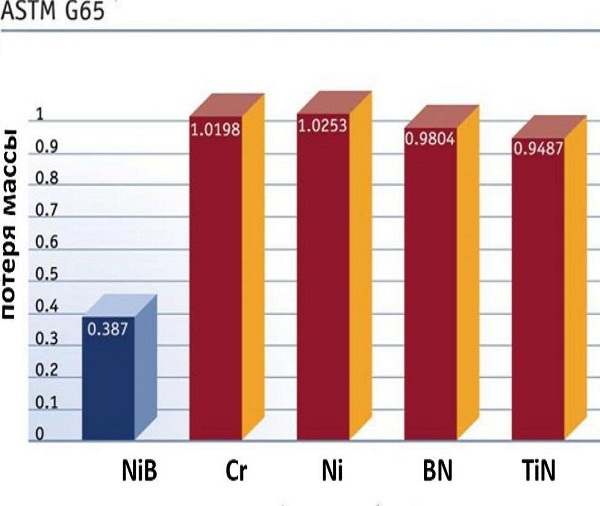 Никельборидное покрытие - одно из самых износостойких покрытий из известных. Технология NiB позволяет получить покрытие, свойства которого существенно превышает характеристики твердого хромистого покрытия, карбида вольфрама и никелевого покрытия. Не вызывает водородную хрупкость. Однородность покрытия по всей толщине осаждения, что дает равномерность нанесения на поверхности со сложным рельефом. Утончение слоя по краям и углам поверхности отсутствует. Покрытие NiB имеет температурный диапазон применения –60 °С до +1000°С при условии жаростойкой основы.